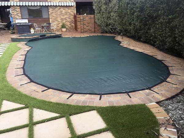 Custom odd shaped pool cover perfectly fitted over a uniquely designed swimming pool in Canberra